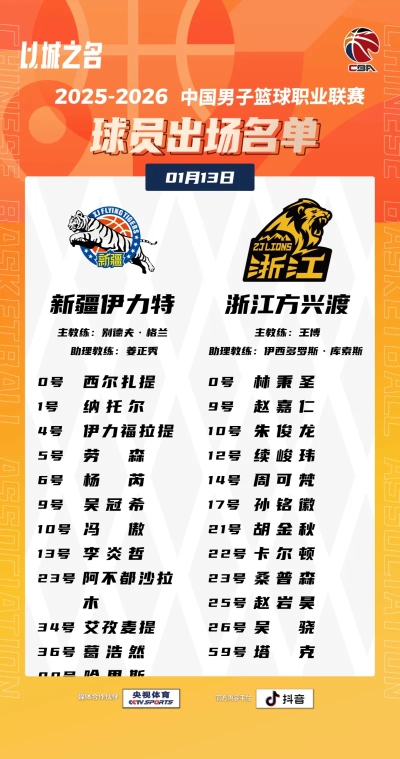 虎扑01月13日讯 今晚CBA常规赛,新疆对阵广厦的大名单已经公布。